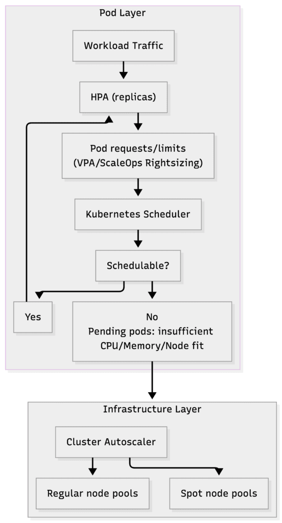 The diagram below shows the flow of scaling signals in AKS: Changes in traffic and pod-level settings (HPA/VPA/ScaleOps) shape scheduling pressure, which then drives node-level actions (Cluster Autoscaler and Spot pools).