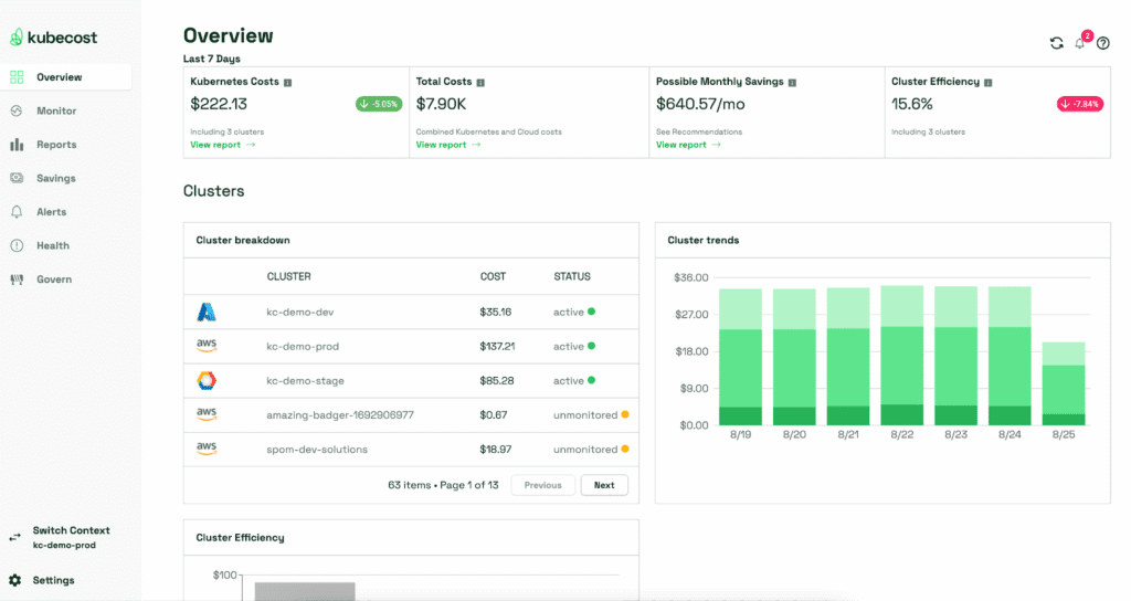 - Real-time Monitoring: Continuous cost tracking across clusters and namespaces