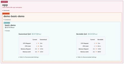 Goldilocks is an open-source solution that recommends how to set resource requests and limits for your pods. It uses the “Off” mode of the Vertical Pod Autoscaler (VPA) to receive right-sizing recommendations for every workload. Goldilocks provides a visualized dashboard with VPA recommendations, making it easier to view and understand resource recommendations for each deployment.